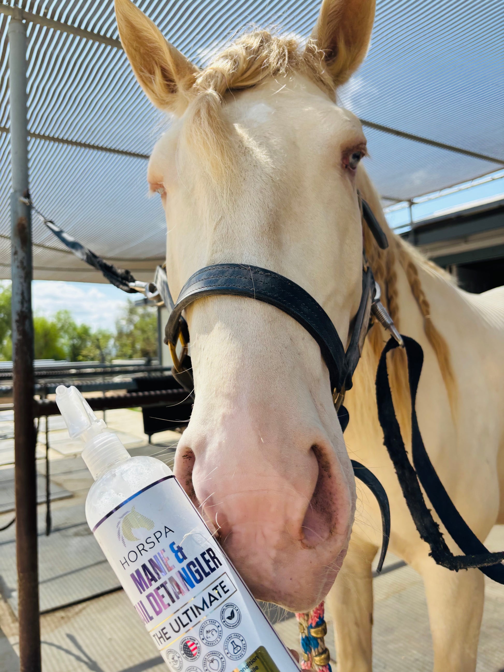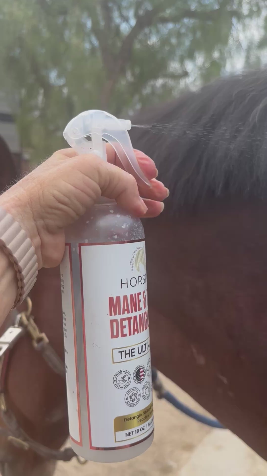 Spray Horspa Instant Detangling Spray on mane and tail. Hair strands will instantly soften, allowing for easy brushing or combing without breakage. Enjoy pain-free, tear-free, and happy horses.