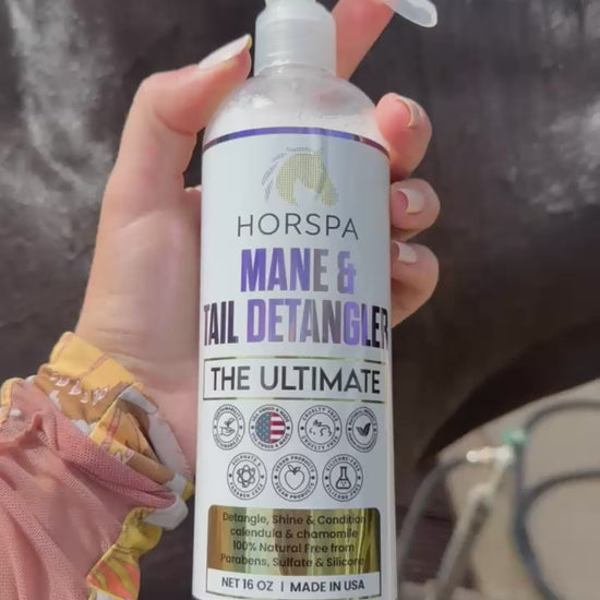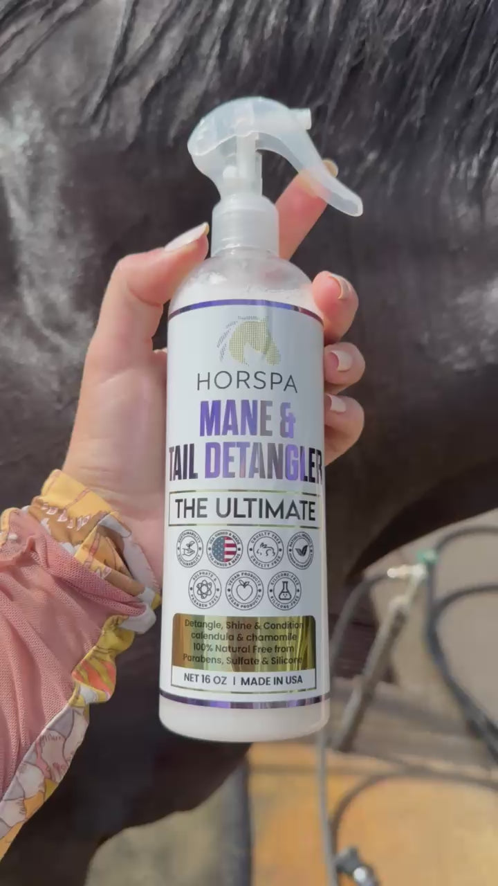 Horspa Mane & Tail Detangling is unmatched when it comes to keeping your horse's mane and tail in top shape. It's our most popular product, trusted by horse enthusiasts . This original, long-lasting conditioner not only makes grooming quick and easy but also reduces hair breakage, all while leaving a pristine, oil-free shine, removes tangles and knots while simultaneously fortifying hair for longer, healthier growth. This lightly scented, easy to use detangler with herbal essences prevents breakage and leaves the mane and tail looking healthy and shiny.